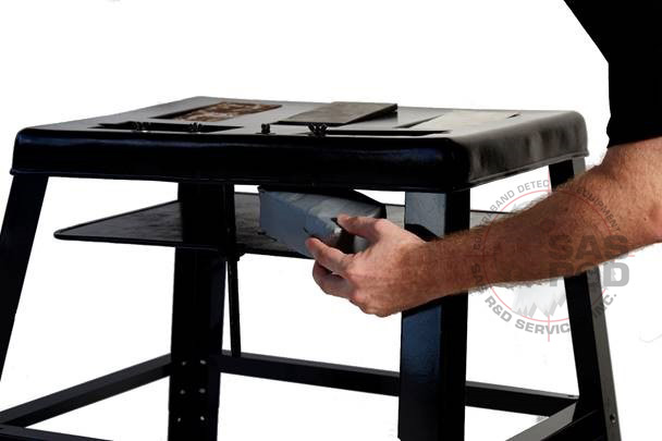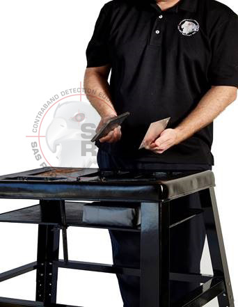 Underneath the table is an adjustable platform that holds the simulated contraband. In our hands-on training we use 2lbs of granulated sugar to represent Cocaine but anything may be used that resembles what you are searching or actual items such as weapons, drugs, cigarettes etc. With the sample of vehicle wall or side material in place, the “contraband” is placed underneath – the Xpose is used to “see” and indicate the difference in density while drawing a graph as the sample is raised and lowered or inspected under various sample materials. We recommend that lead be one of the samples to show what happens when something is lead shielded.